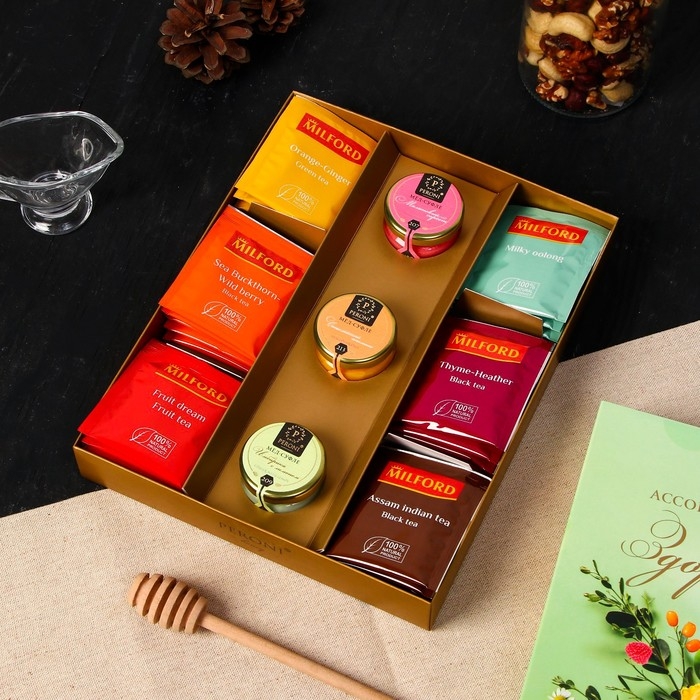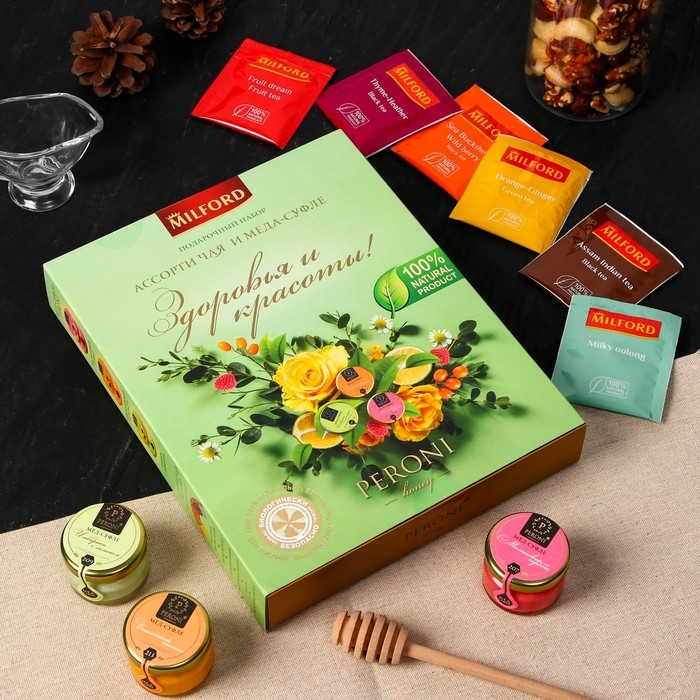 Крем-мед Peroni - это 100% настоящий эко-продукт, изготовленный с любовью и заботой, пыльца и нектар собранный пчелами на пасеках с экологически чистых полей и пчелиных фермерский угодий. Набор "Здоровья и Счастья" - 3 баночки мед суфле по 30 г с ассорти чая в пакетиках (6 вкусов * 5 пак.), уложенные в стильную подарочную упаковку премиум качества. Состав крем меда натуральный, без искусственных добавок, красителей и консервантов, ведь мед - отличный консервант, а орехи, сок фруктов и сублимированные ягоды придают ему приятный нежный цвет.