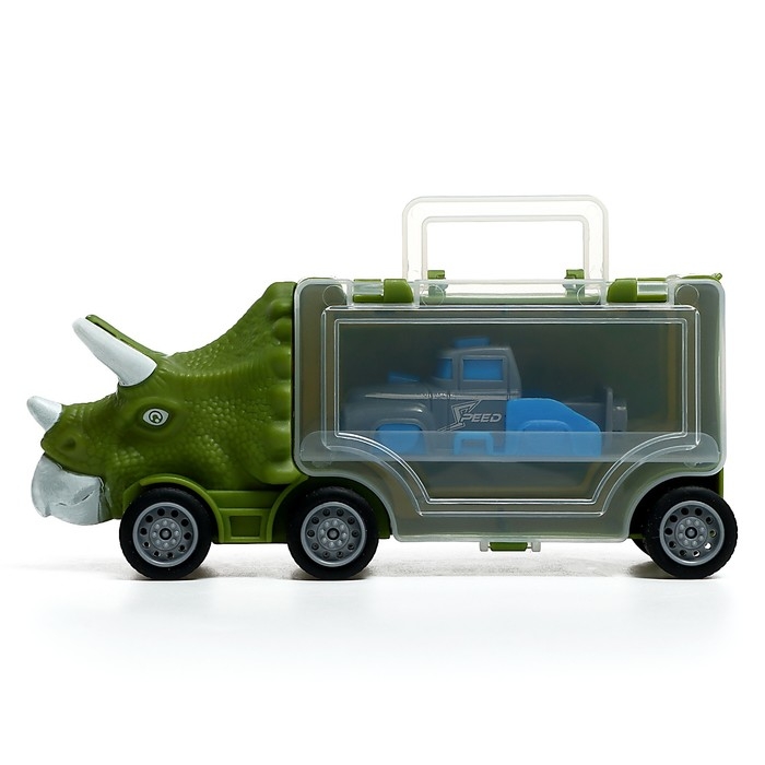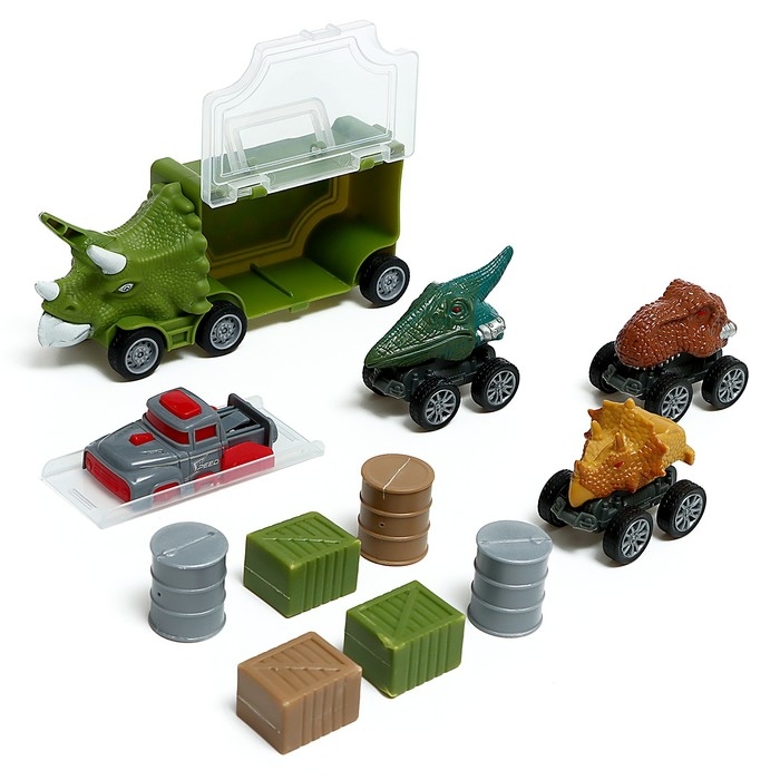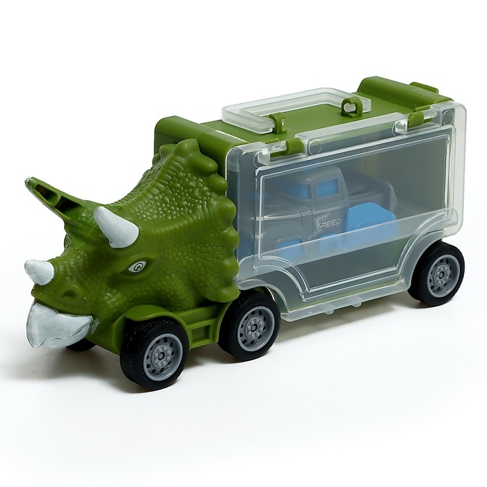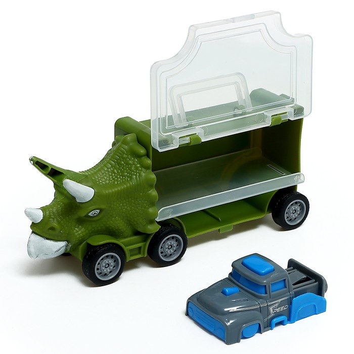Грузовик «Дино-перевозчик» готов доставить машинки для скоростных соревнований в любое время и в любое место. Загрузите машины в кузов автомобиля и начинайте игру. С ярким транспортом в виде динозавров игровым сюжетам мальчишки не будет предела. Ребёнок устроит настоящие гонки и будет состязаться с друзьями в быстрой и манёвренной езде.