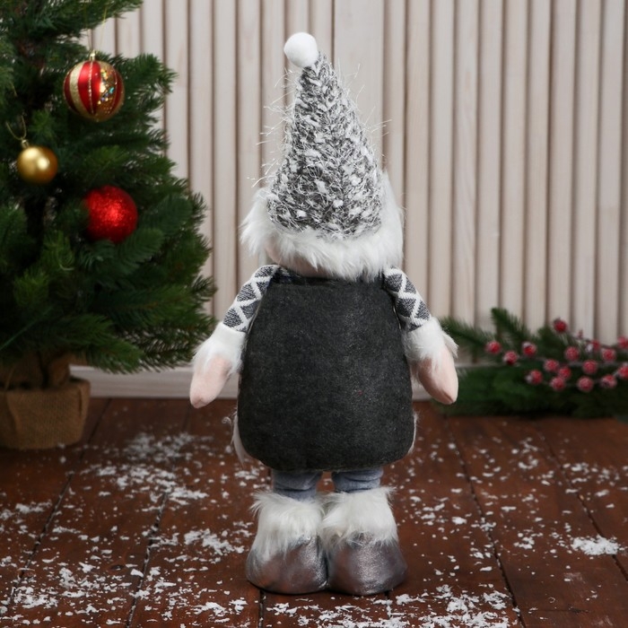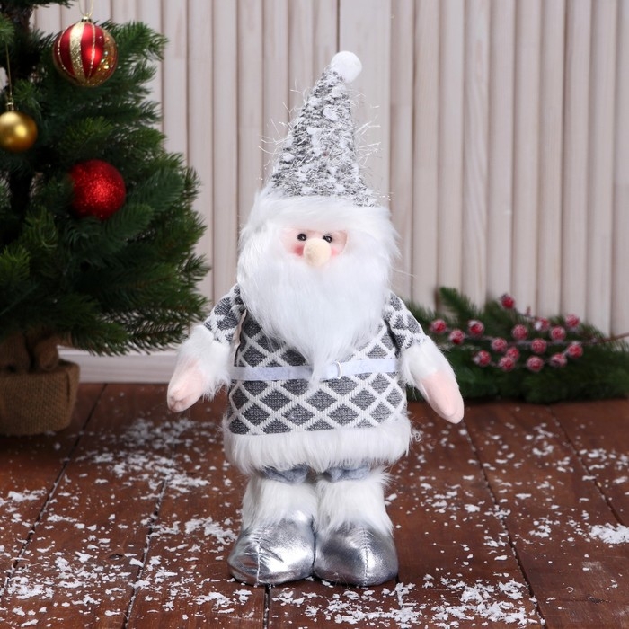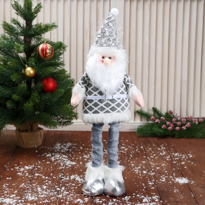 Мягкая игрушка "Дед Мороз в костюме с ремешком, длинные ножки" стоит, бело-серый
