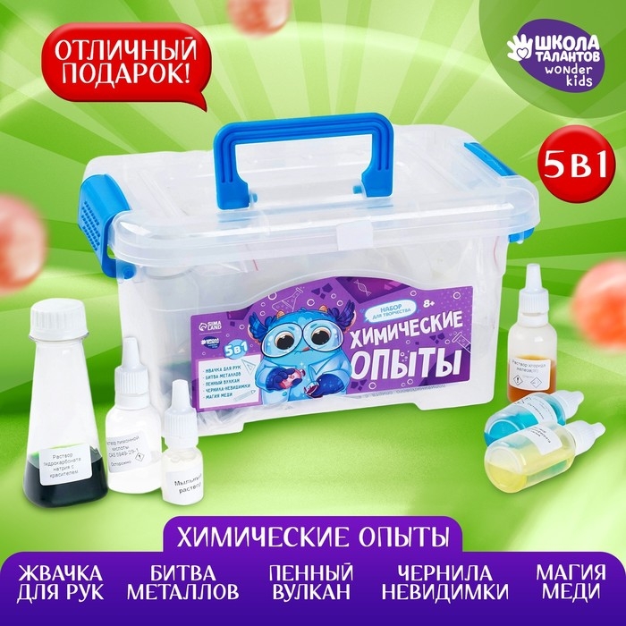 С набором для опытов ребёнок узнает об удивительных свойствах химии, проведёт 5 увлекательных экспериментов дома и удивит своих друзей.
