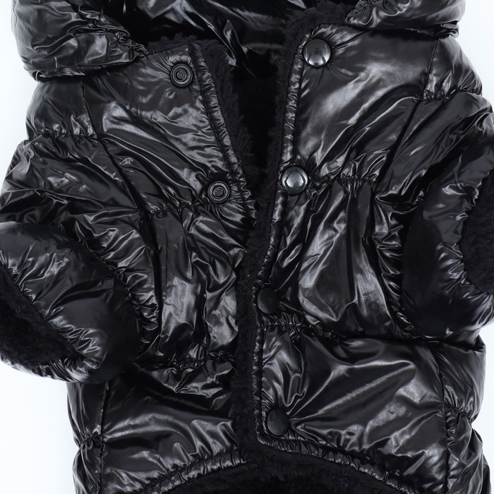 Комбинезон выполнен из нейлона, обеспечивая защиту от влаги и ветра, а внутри утеплен искусственным мехом для максимального тепла и комфорта. Комбинезон оснащен кольцом на спине, чтобы пристегивать поводок для прогулки, а также клепками на животе, что обеспечивает легкое надевание и снятие комбинезона.