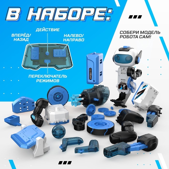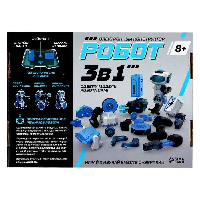 Электронный конструктор «Робот» — набор для сборки одной из трёх моделей: доставщика, снайпера или футболиста. Каждый робот выполняет своё уникальное действие!