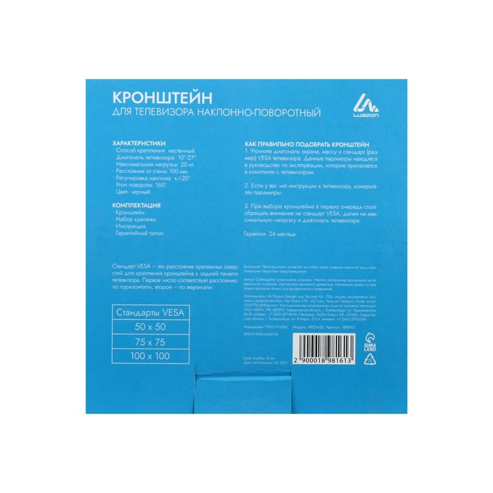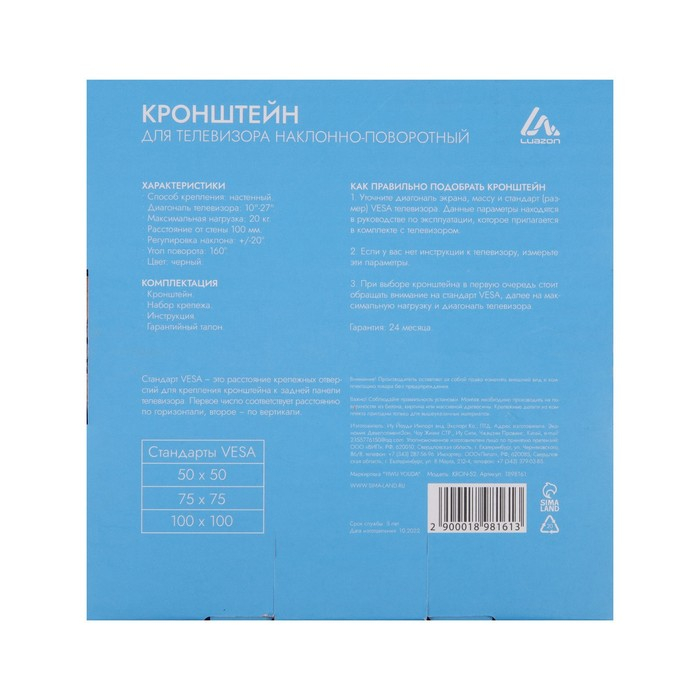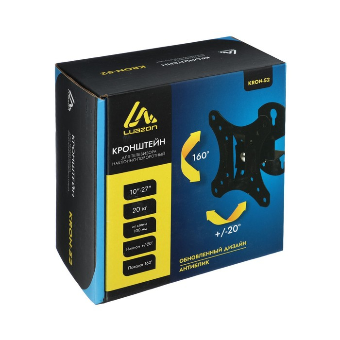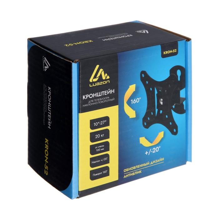 Кронштейн Luazon KrON-52, для ТВ, наклонно-поворотный, 10-27", до 20 кг, черный