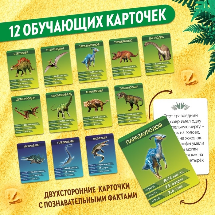 - В комплекте 12 обучающих карточек с интересными фактами о динозаврах.