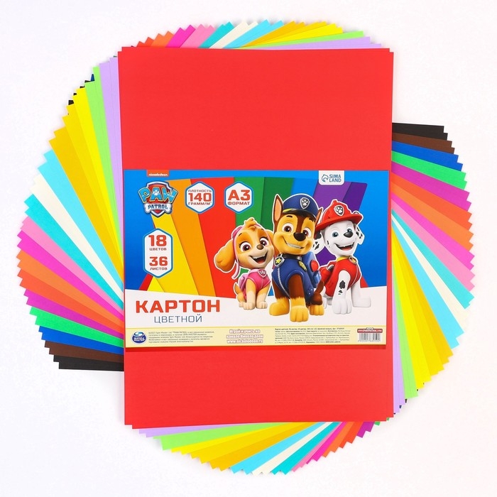 Картон цветной тонированный, А3, 36 листов, 18 цветов, немелованный, двусторонний, в пакете, 140 г/м², Щенячий патруль