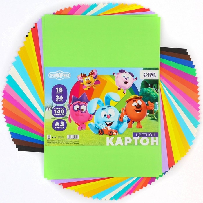 Картон цветной тонированный, А3, 36 листов, 18 цветов, немелованный, двусторонний, в пакете, 140 г/м², Смешарики