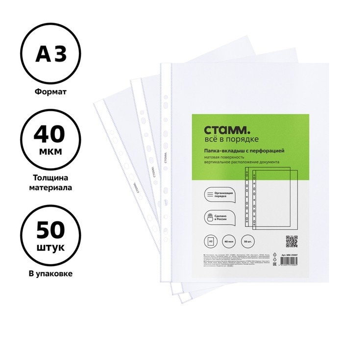 Файл-вкладыш А3, 40 мкм, Стамм, матовый, вертикальный, 50 штук