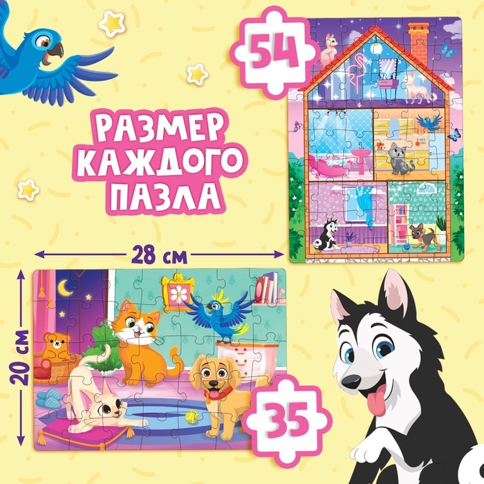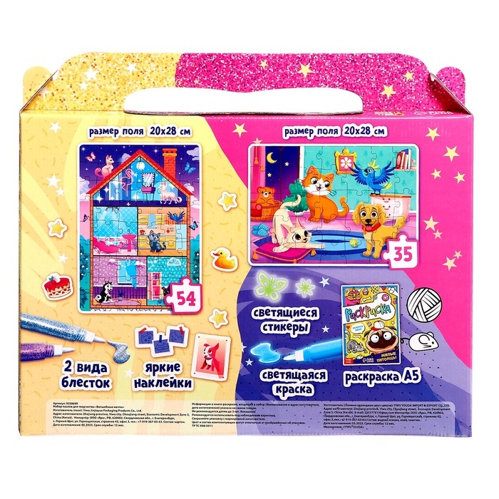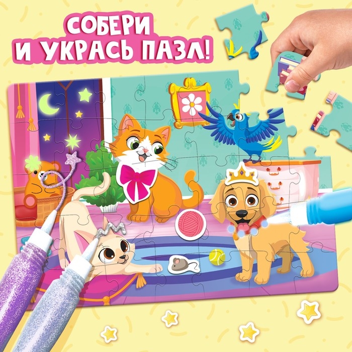 - Ребёнок соберёт 2 пазла с разным количеством деталей и украсит их декором из набора.