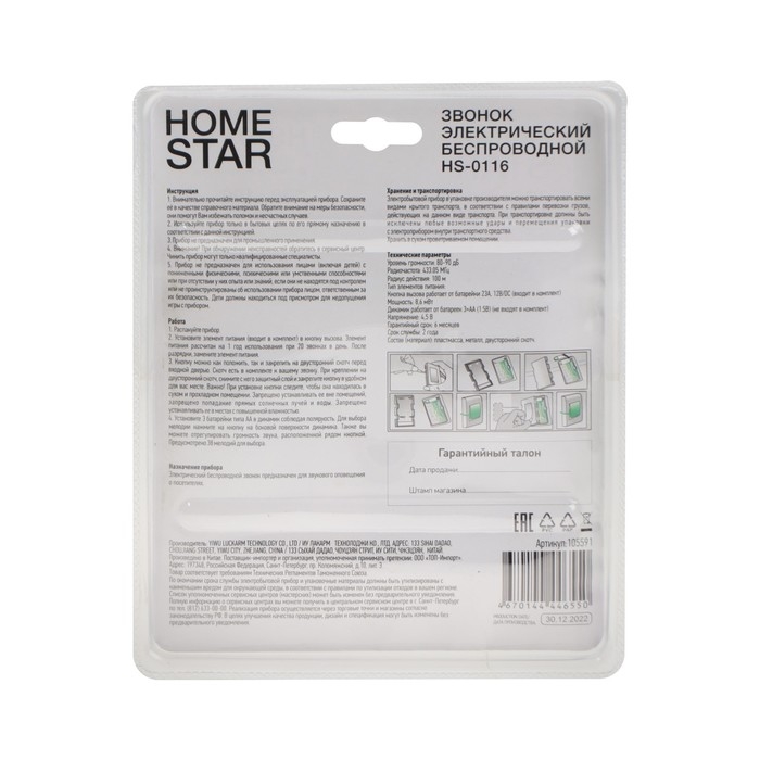 Звонок HomeStar HS-0116, беспроводной, 8,6 МВт, 38 мелодий, 80-90дБ, r=100м, белый