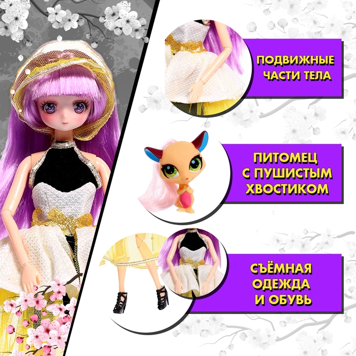 Шарнирная кукла «Пушистая магия» — настоящая мечта для каждой маленькой девочки, которая любит аниме и моду. В комплекте с куклой идёт милый питомец, который станет ей верным другом. Куколка упакована в красочную коробку, поэтому её можно вручить в качестве подарка без дополнительной праздничной упаковки.