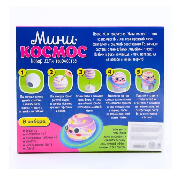 Набор для творчества «Мини-космос» — креативное и необычное развлечение для вашего ребёнка. Светящийся мини-космос станет не только оригинальным декором в детскую комнату, а также станет ночником.