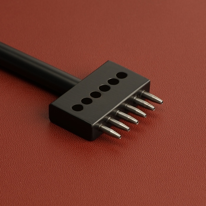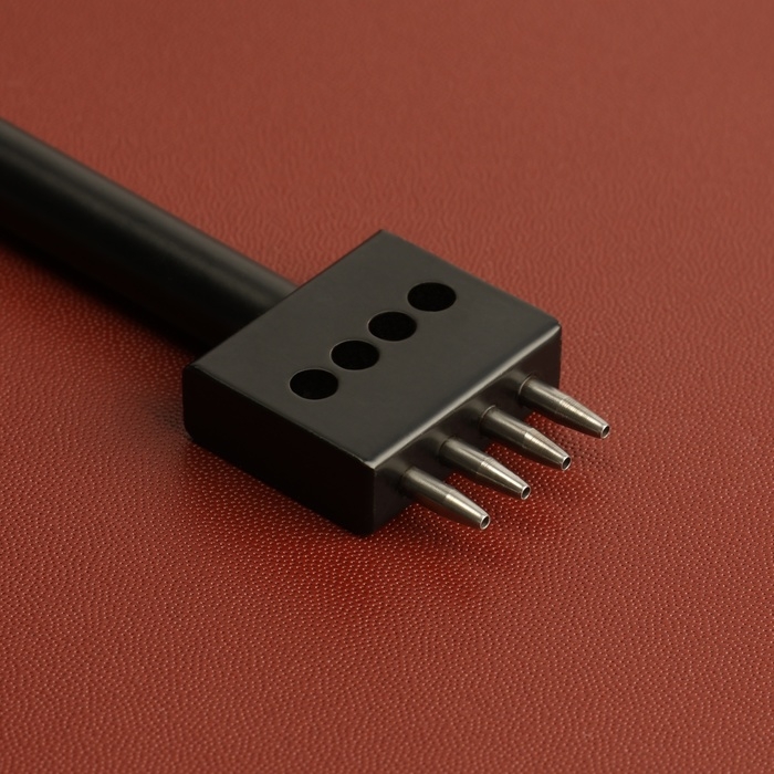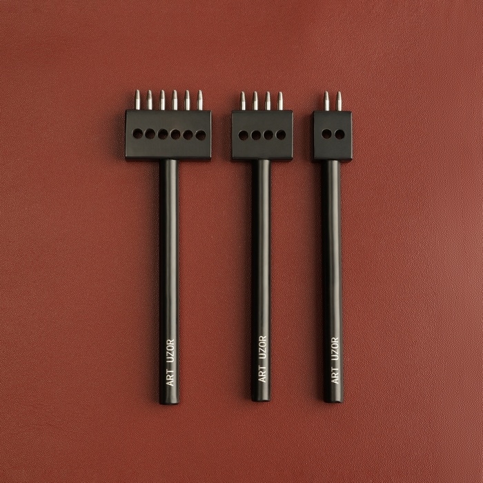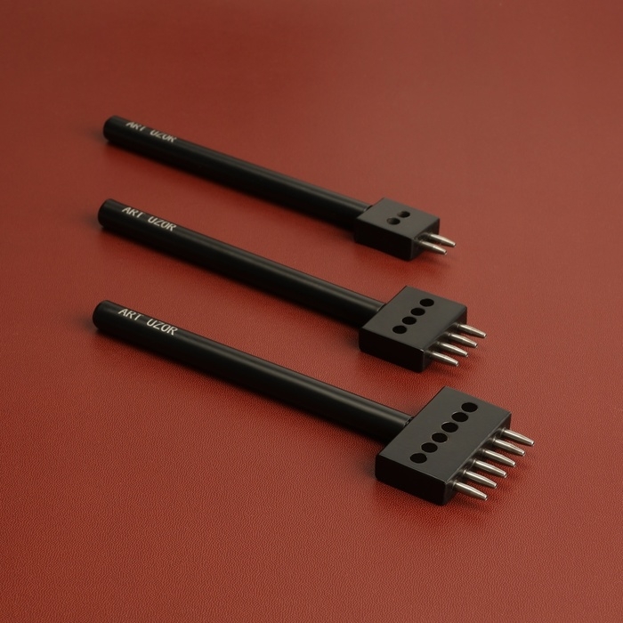 Строчные круглые пробойники необходимы для создания в коже аккуратных и равноудалённых друг от друга отверстий под будущие швы. Они позволяют сделать классическую прямую строчку. Пробойник с 2 зубьями удобно применять в работе на изгибах и на углах изделий. Пробойники с 4-6 зубьями экономят время работы при создании длинной строчки.
