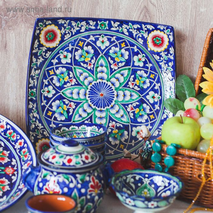 Ляган Риштанская Керамика "Узоры", 31 см, квадратный, синий