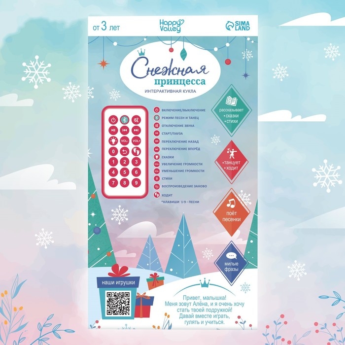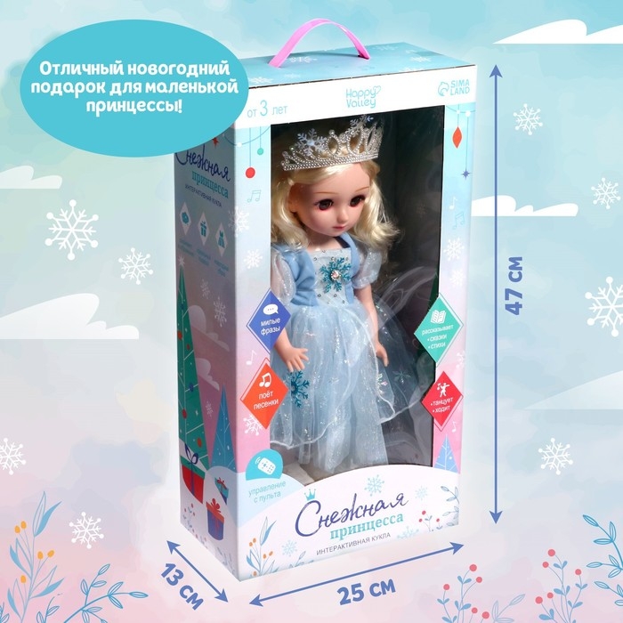Интерактивная кукла «Снежная принцесса» — это увлекательная игрушка-рассказчица для детей от 3 лет, которая оснащена звуковыми и световыми эффектами. Высота куклы составляет 38 см — это делает её удобной для игр и переноски. Кукла способствует развитию социальных навыков, воображения и творческого мышления. Она станет верным другом для вашего ребёнка и будет сопровождать его дома и в садике.