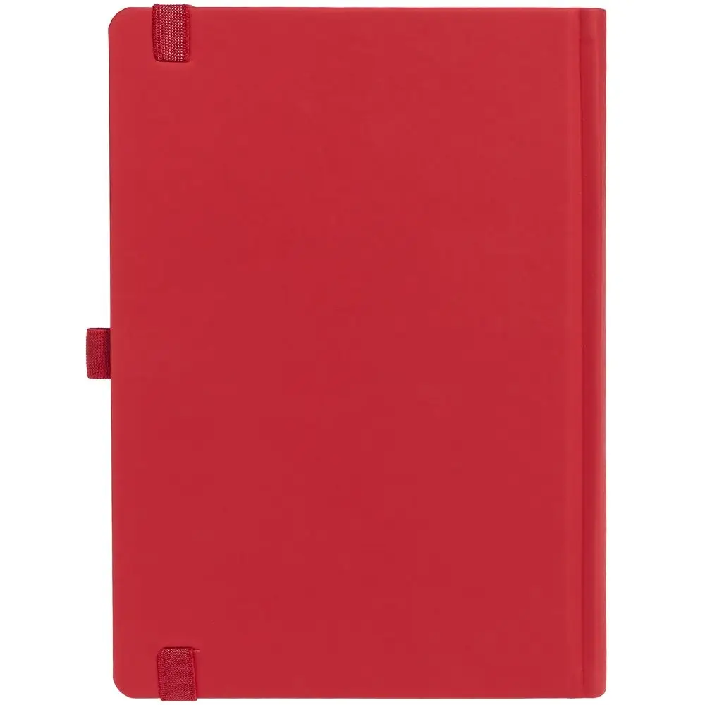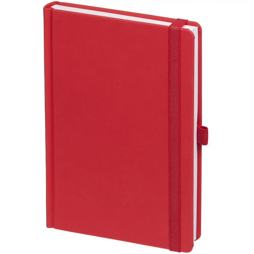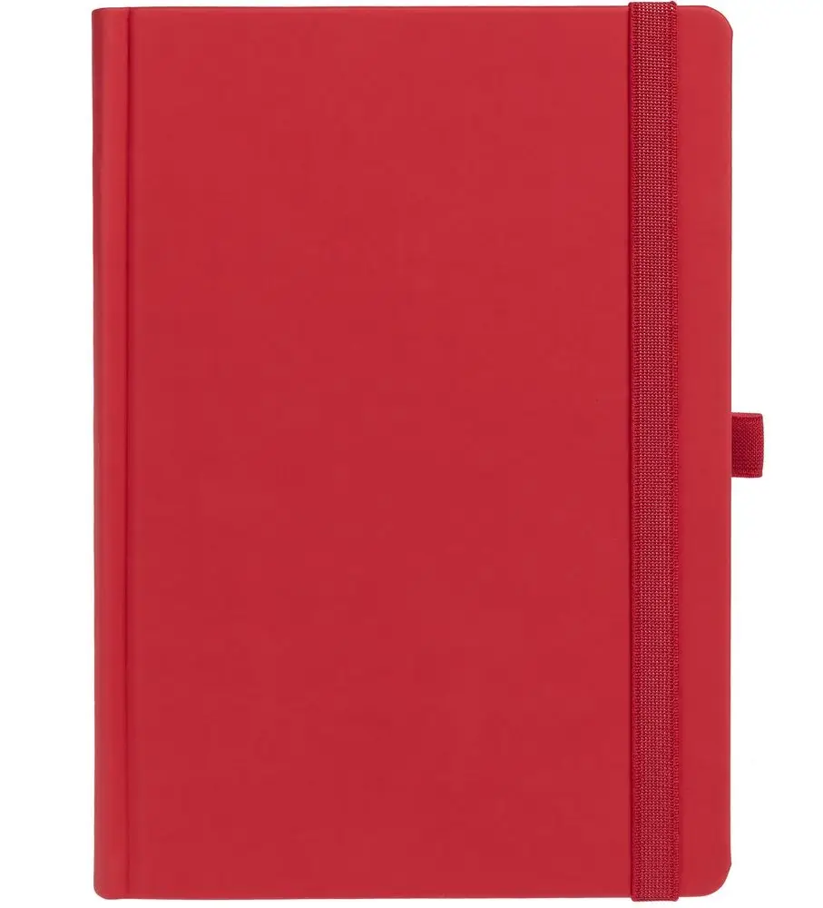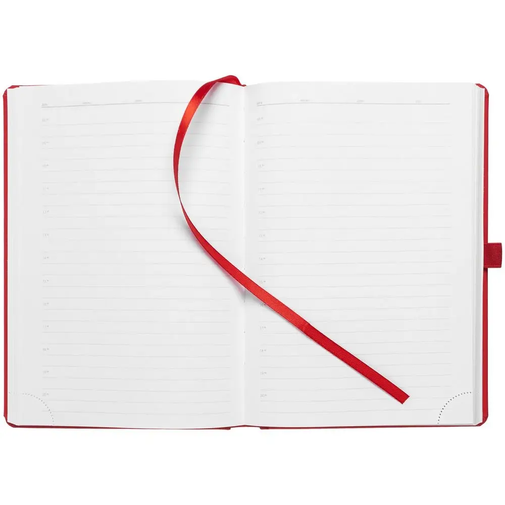 Ежедневник с твердой обложкой без поролона, выполнен из материала Soft Touch Ultra, красный РР, дополнен резинкой шириной 1 см, петлей-резинкой для ручки, капталом и ляссе красного цвета.