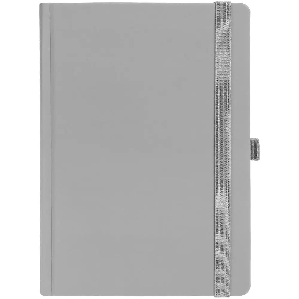 Ежедневник с твердой обложкой без поролона, выполнен из материала Soft Touch, серый СС, дополнен резинкой шириной 1 см, петлей-резинкой для ручки, капталом и ляссе серого цвета.