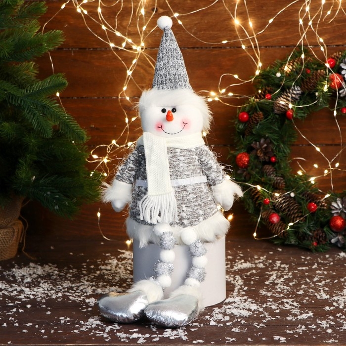 Мягкая игрушка "Снеговик в колпаке и шарфике, ножки-бусинки" 15х39 см, серый