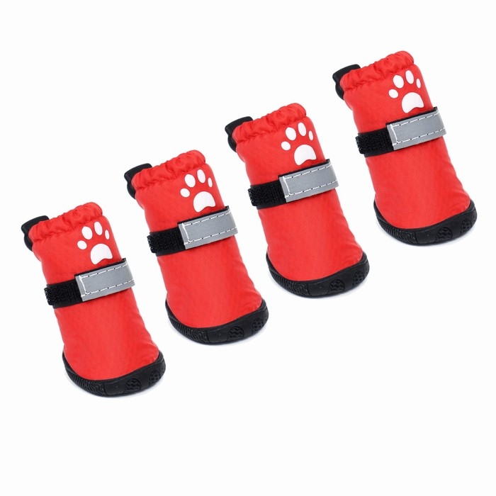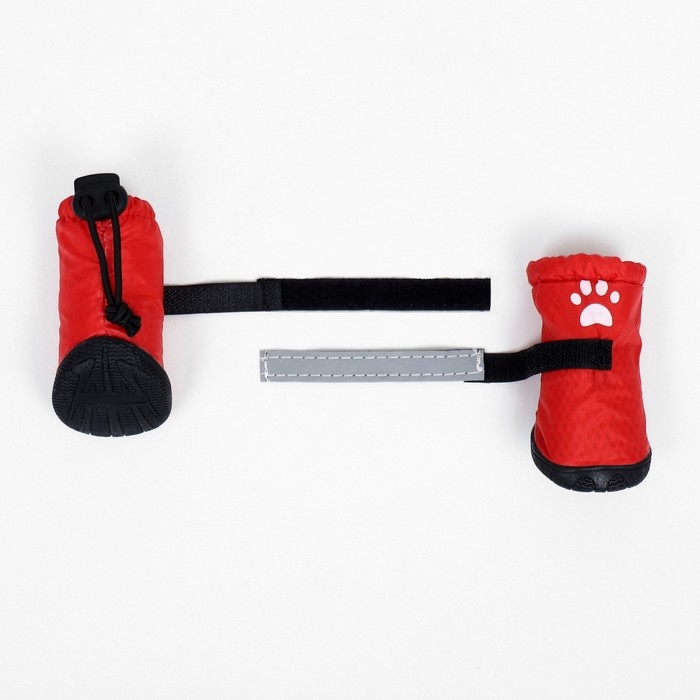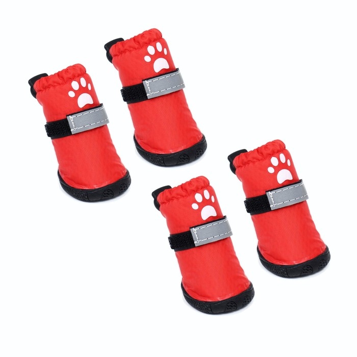 Застёжка-липучка надёжно фиксирует обувь , что позволяет легко надевать и снимать, также сверху имеется утягивающая кулиска. Для безопасности питомца липучка имеет светоотражающую ленту.