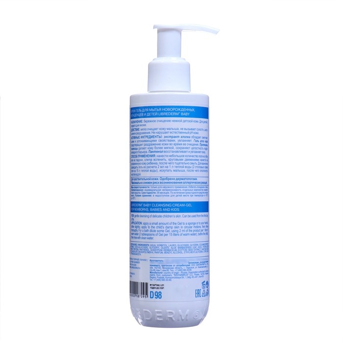 LIBREDERM Baby крем-гель для мытья новорожденных, младенцев и детей 250 мл. Крем-гель предназначен для бережного очищения нежной детской кожи. Мягко воздействует на верхние слои кожи малыша, не вызывает сухости. Экстракт хлопка обладает смягчающими и успокаивающими свойствами, увлажняет кожу малыша. Гель алоэ вера способствует предотвращению раздражения кожи во время ее очищения. Протеины пшеницы делают кожу более мягкой, способствуют сохранению целостности гидролипидного барьера. Пантенол восстанавливает и увлажняет кожу во время мытья.