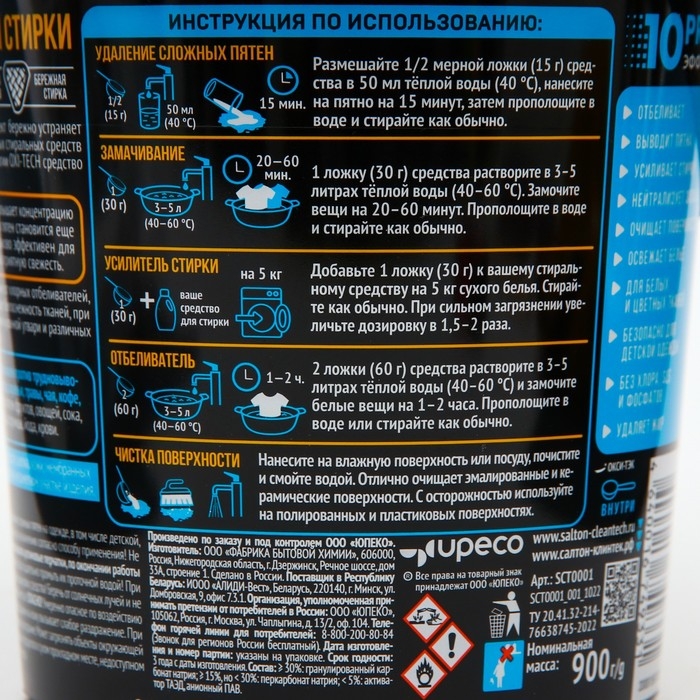 Salton CleanTech 900 грамм - это мощный кислородный пятновыводитель, разработанный для эффективного удаления даже самых упорных пятен с различных поверхностей. Его специальная формула основана на активном кислороде, который активируется при контакте с пятнами, делая процесс удаления максимально простым и эффективным. Этот продукт идеально подходит для борьбы с пятнами от вина, кофе, жира, краски, травы и многих других видов загрязнений. Salton CleanTech - ваш надежный помощник в борьбе с пятнами, который вернет вашим вещам и поверхностям первоначальную чистоту и свежесть.