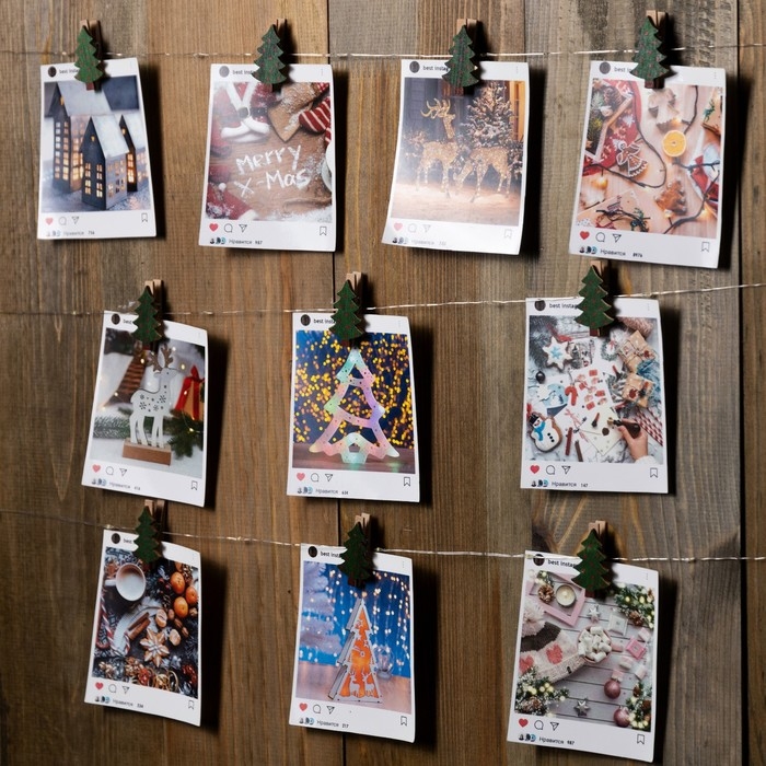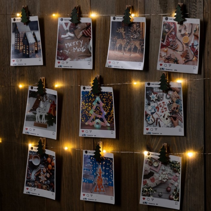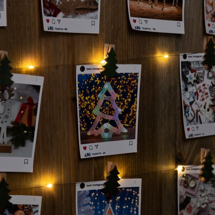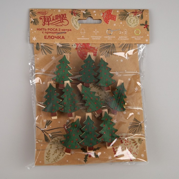 Гирлянда «Нить» 2 м роса с насадками «Прищепки-ёлочки», IP20, серебристая нить, 20 LED, батарейки ААх2 (не в комплекте), свечение тёплое белое