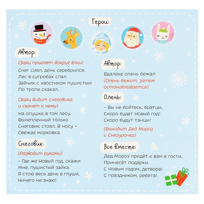 - В комплекте сценарий игры и 5 масок: Дедушка Мороз, Снегурочка, оленёнок, зайка и снеговик
