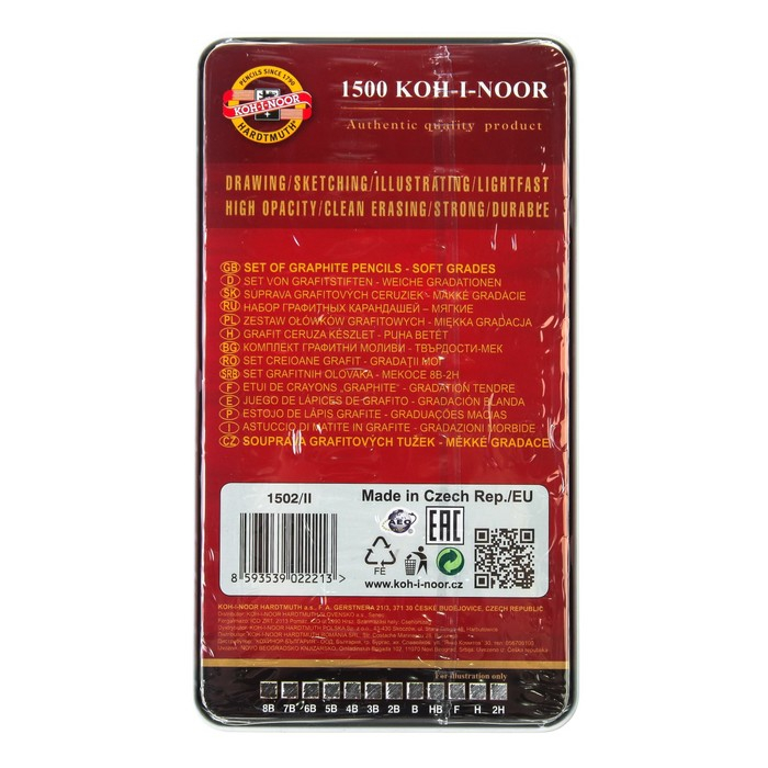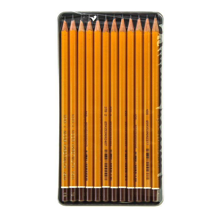 Набор карандашей чернографитных разной твердости 12 штук Koh-i-Noor 1502/II, 8B-2H, в металлическом пенале