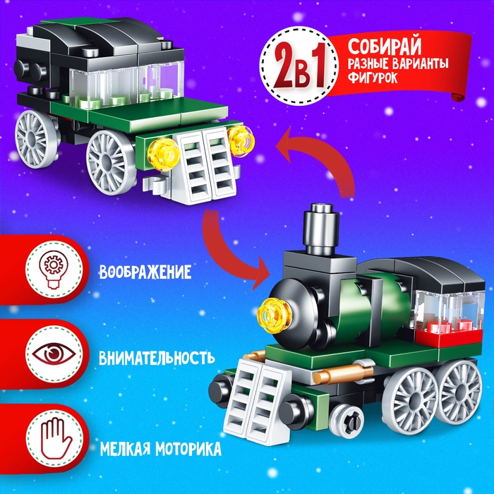 С конструктором «Новогодние истории. Поезд и снеговик» ребёнок прокачает мелкую моторику, логическое и пространственное мышление.