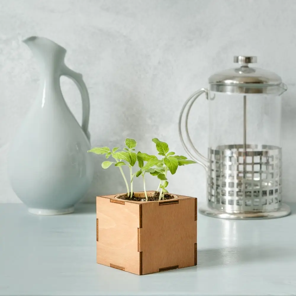 В наборе: деревянный куб, бумажный стаканчик, питательный грунт, семена, вермикулит.