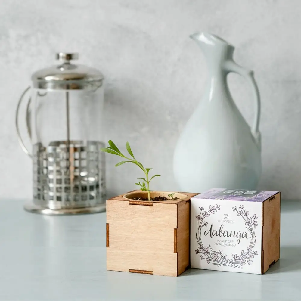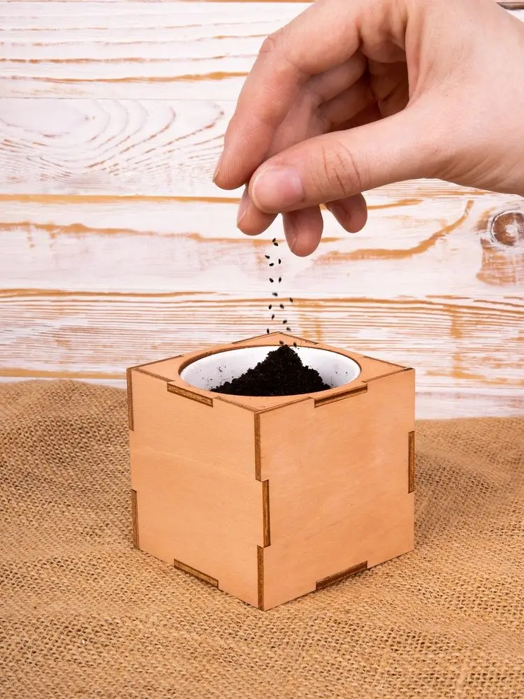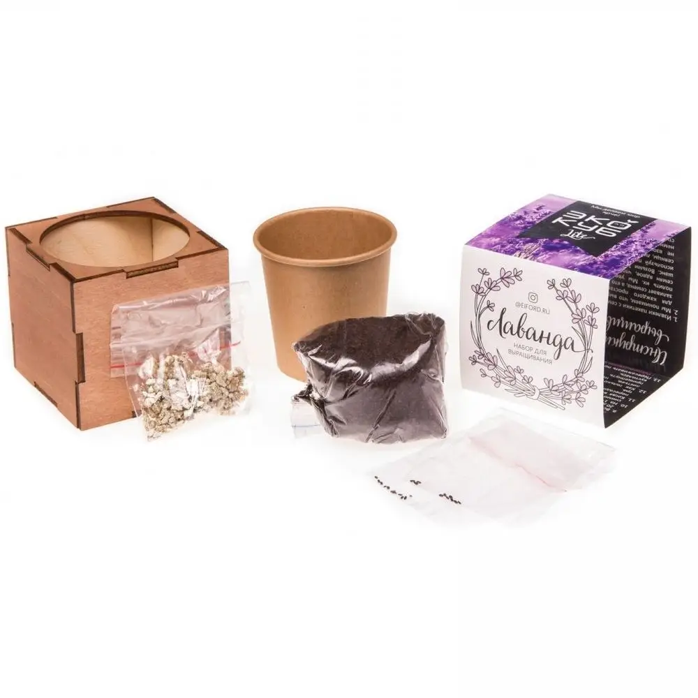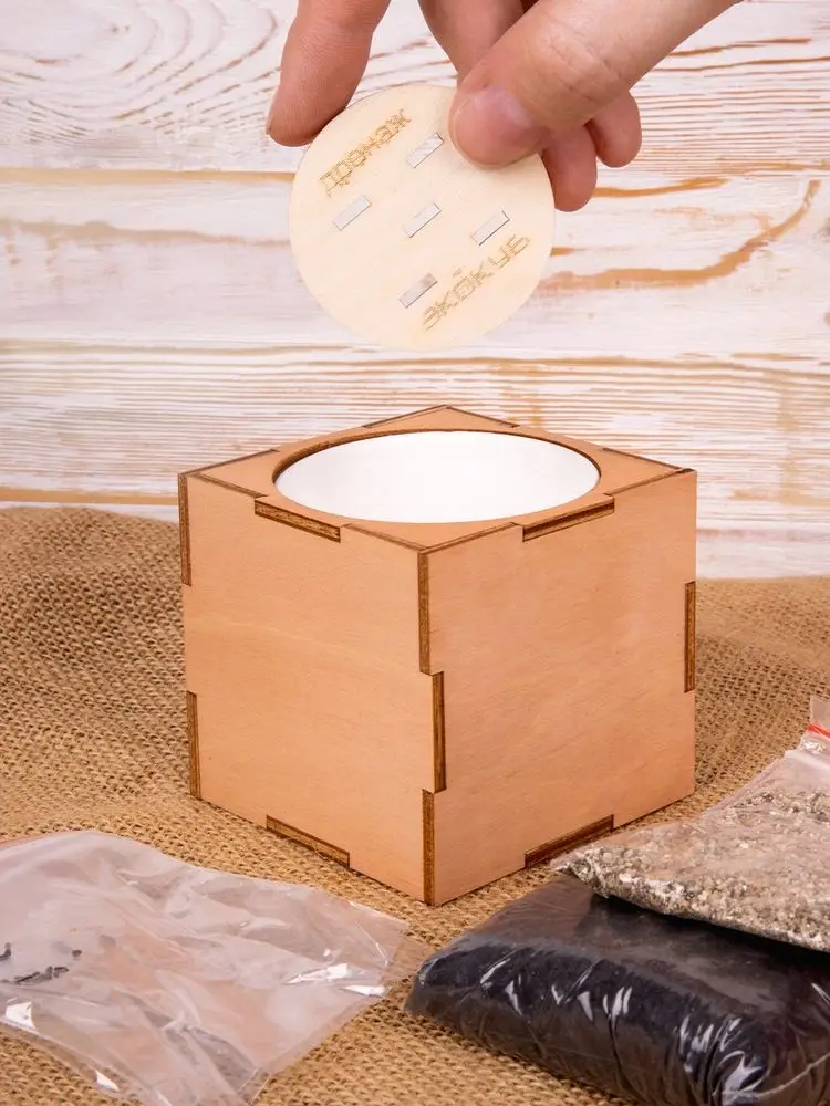 В наборе: деревянный куб, бумажный стаканчик, питательный грунт, семена, вермикулит.