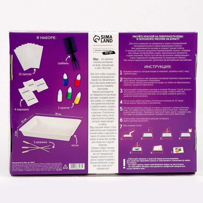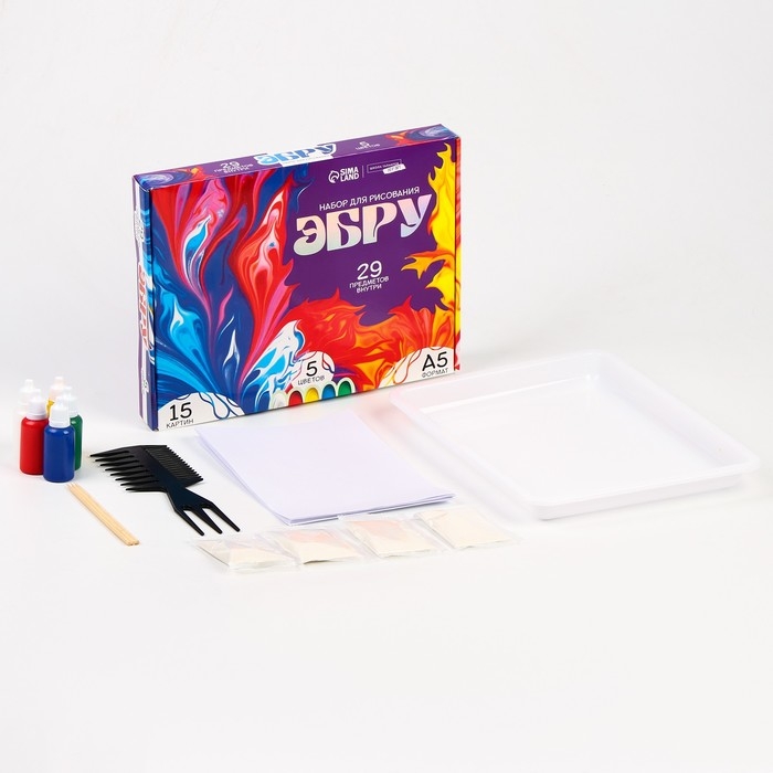 Набор для рисования эбру: краски 6 цв по 6 мл, 10 листов бумаги, загуститель 10 г, инструменты, поддон