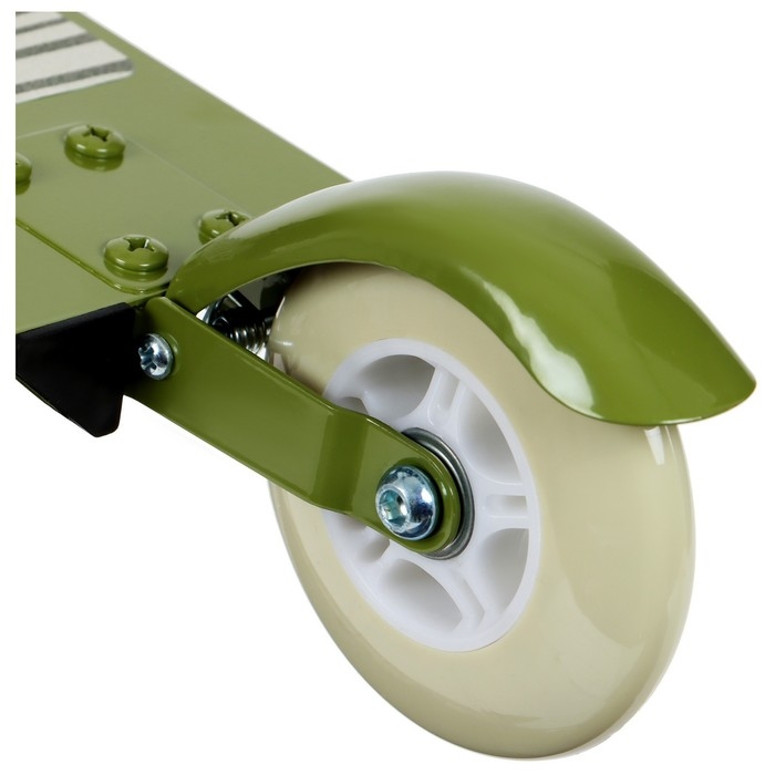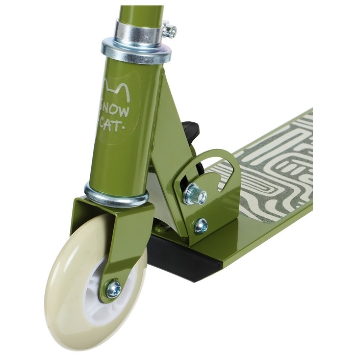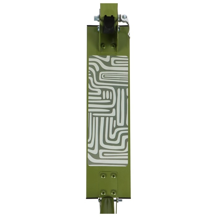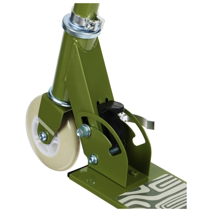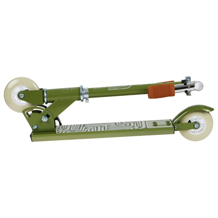 Платформа с шероховатым покрытием предотвращает скольжение ног. Высота руля регулируется и фиксируется в трёх положениях. Рама складывается: рулевая стойка опускается к деке. В таком положении самокат занимает мало места.