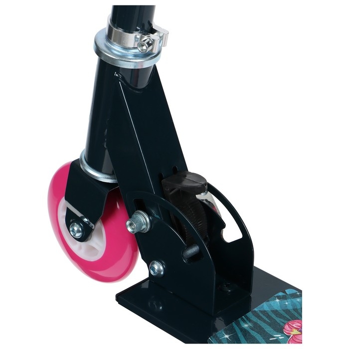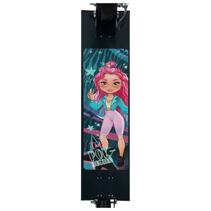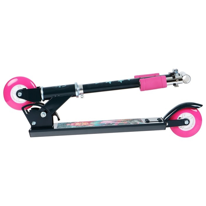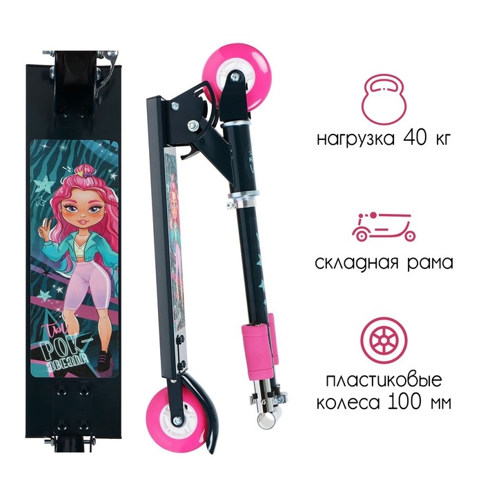 Платформа с шероховатым покрытием предотвращает скольжение ног. Высота руля регулируется и фиксируется в трёх положениях. Рама складывается: рулевая стойка опускается к деке. В таком положении самокат занимает мало места.