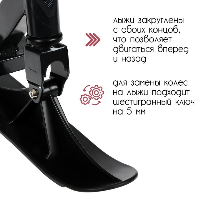 Самокат-снегокат актуален зимой и летом. На колёсах можно кататься по любым ровным поверхностям в сухое время года, зимой — на лыжах по снегу.