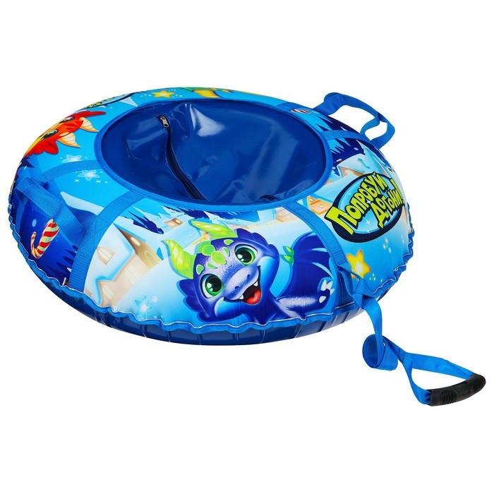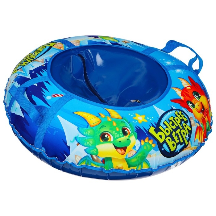 Дно тюбинга изготовлено из тентовой ткани плотностью 550–650 г/м², что гарантирует долгий срок службы и обеспечивает отличное скольжение. Снаряд оснащён безопасными ручками и молнией для быстрого доступа к камере. Имеет закрытую сердцевину, что исключает попадание снега внутрь. Для тюбинга подойдёт камера 13 дюймов. Предназначен для детей от 5 лет.