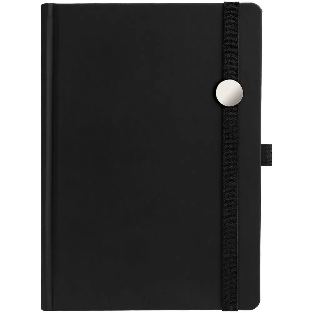 Ежедневник с твердой обложкой без поролона, выполнен из материала Soft Touch, черный АА, дополнен резинкой шириной 1 см, петлей-резинкой для ручки, капталом и ляссе черного цвета.