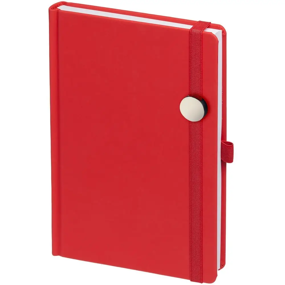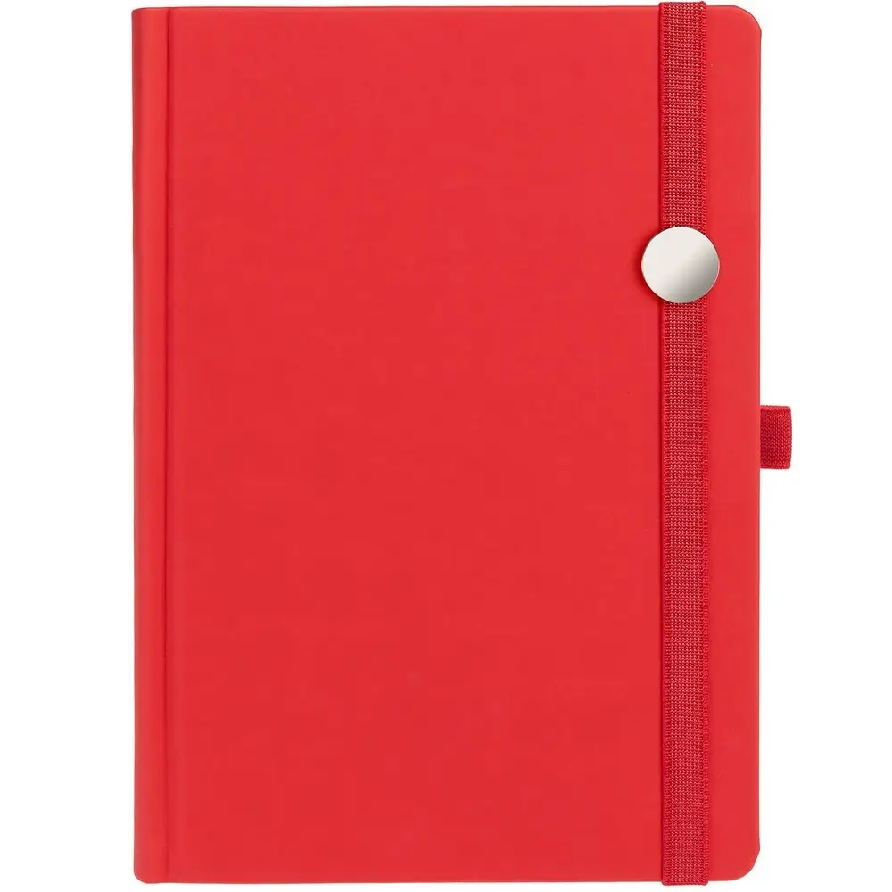 Ежедневник с твердой обложкой без поролона, выполнен из материала Soft Touch Ultra, красный РР, дополнен резинкой шириной 1 см, петлей-резинкой для ручки, капталом и ляссе красного цвета.