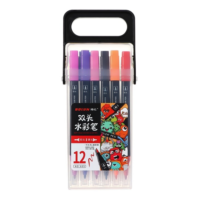 Набор маркеров профессиональных 12 штук, двусторонне, в пластиковом пенале с ручкой, 12 цветов