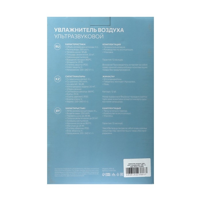 Увлажнитель воздуха Luazon HM-8, ультразвуковой, 25Вт, 4л, 20м2, белый