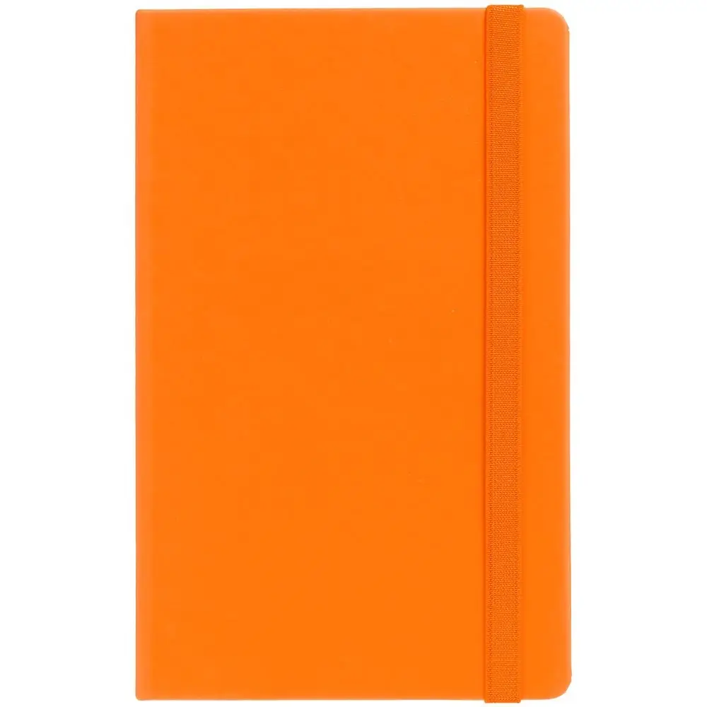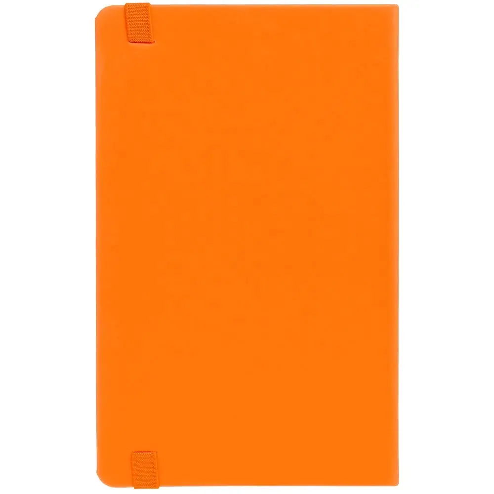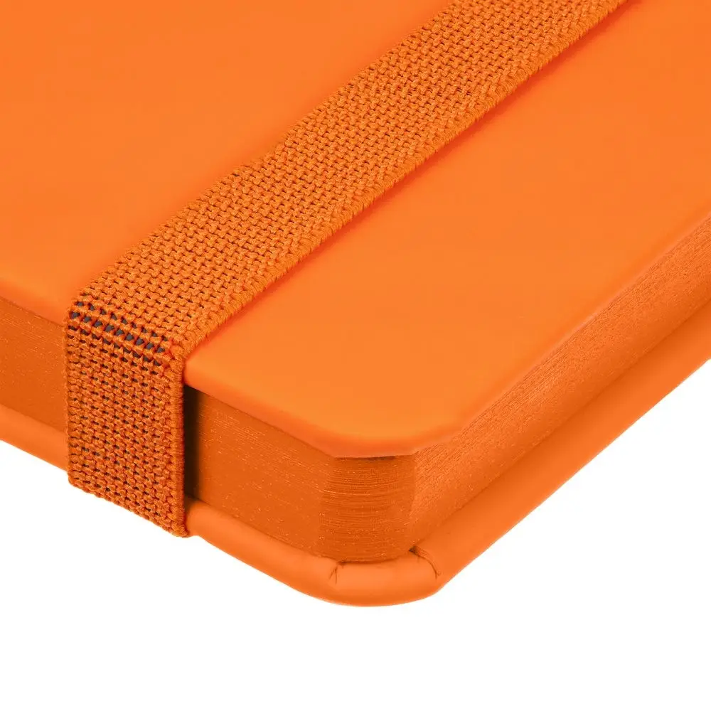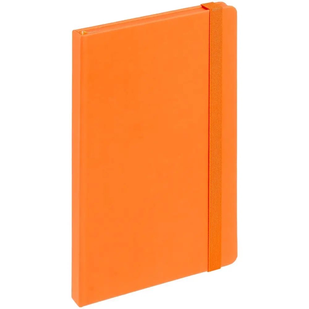 Блокнот в твердой обложке, выполнен из материала Soft Touch, оранжевый ОО, дополнен резинкой и ляссе в цвет обложки.