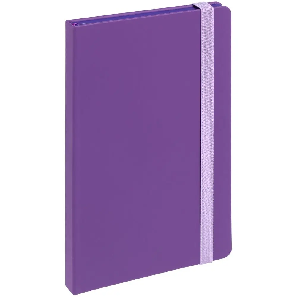 Блокнот в твердой обложке, выполнен из материала Soft Touch, фиолетовый UU, дополнен резинкой и ляссе в цвет обложки.