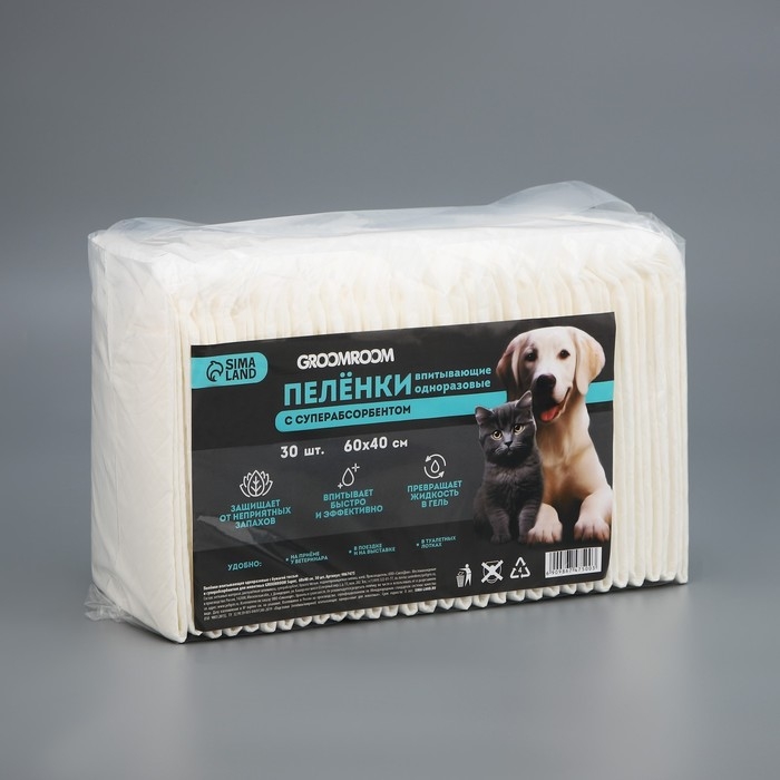 Пелёнки одноразовые с суперабсорбентом для животных, 60 х 40 см, 30 шт