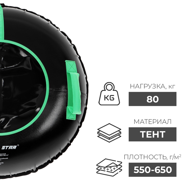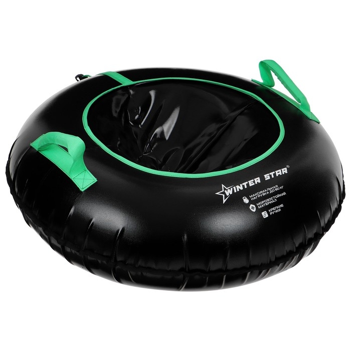 Дно тюбинга изготовлено из тентовой ткани, что гарантирует долгий срок службы и обеспечивает отличное скольжение. Снаряд оснащён безопасными ручками и молнией для быстрого доступа к камере. Имеет закрытую сердцевину — это исключает попадание снега внутрь. Для тюбинга подойдёт камера 14 дюймов. Предназначен для детей от 12 лет.