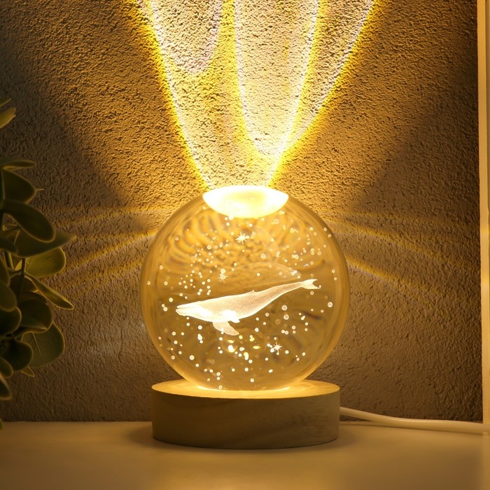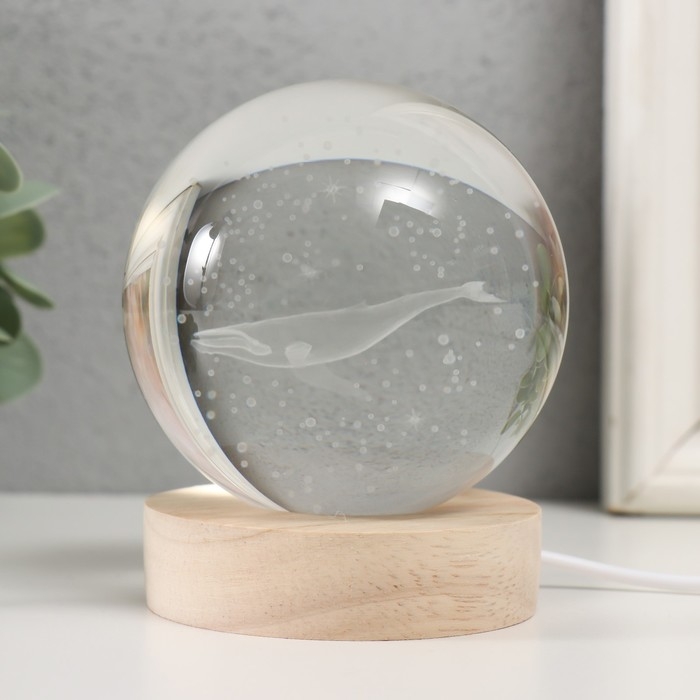 Сувенир стекло подсветка "Кит" d=8 см подставка дерево, USB 8х8х9,5 см