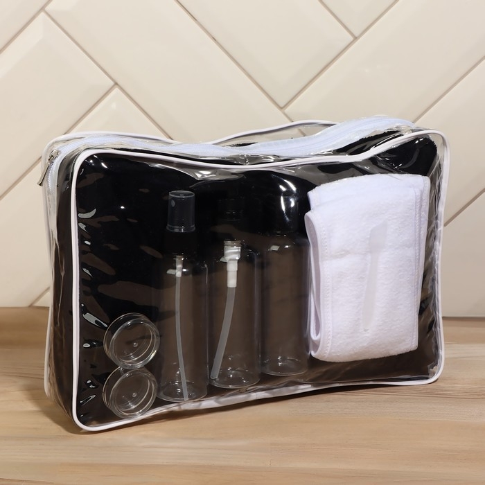 Данный набор состоит из 8 полезных приспособлений для поддержания ухоженного вида. Содержит: чёрное полотенце, 3 бутылочки, 2 баночки, лопатку, повязку на голову. А удобная косметичка на молнии является отличным дополнением, с которым Вы легко сможете организовать пространство в вашей сумке или чемодане. В минималистичные бутылочки с дозатором можно перелить любимые косметические средства. Набор не займет много места, но будет радовать Вас каждый раз при использовании.