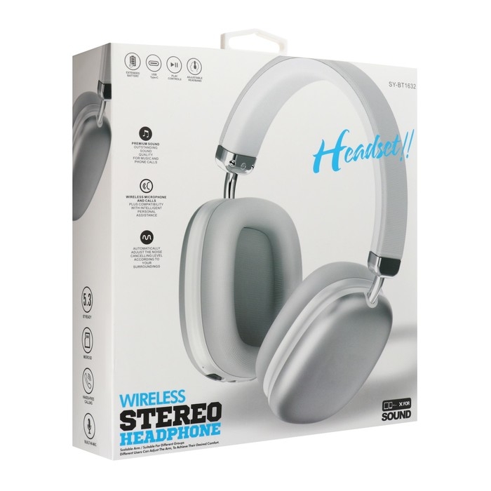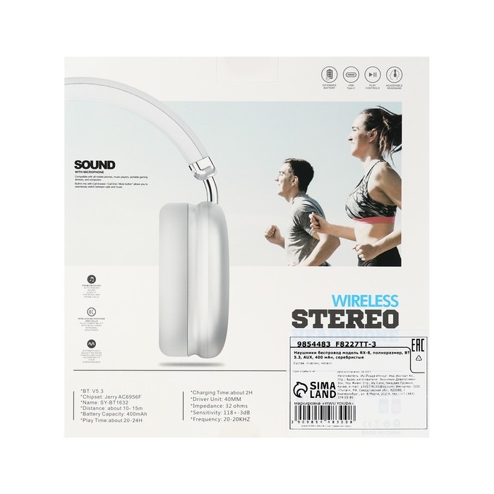 Наушники беспроводные RX-8 полноразмерные, микрофон, BT5.3, AUX, 400мАч, серебристые