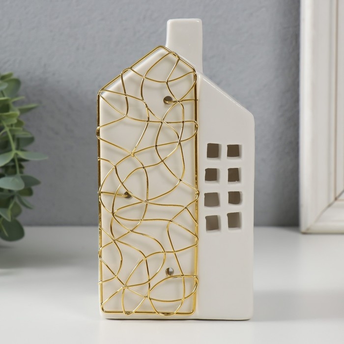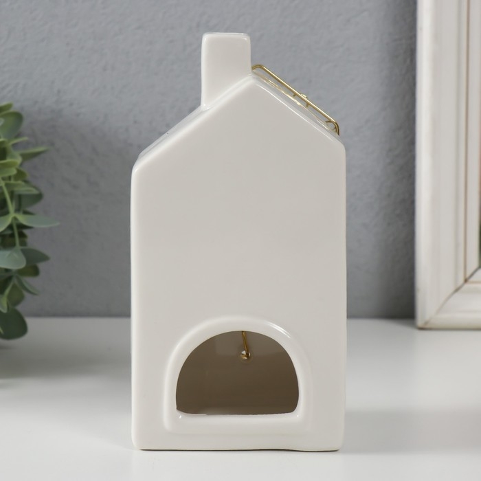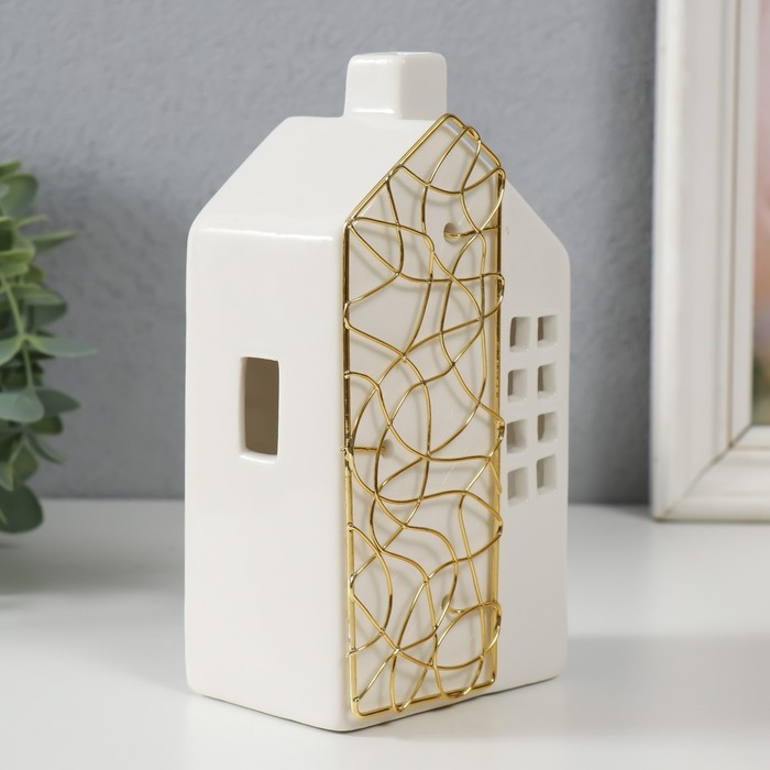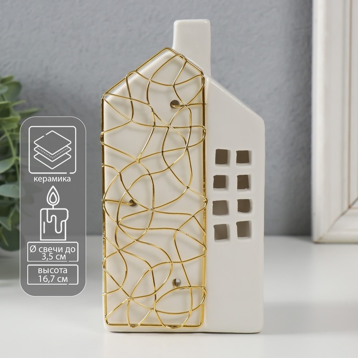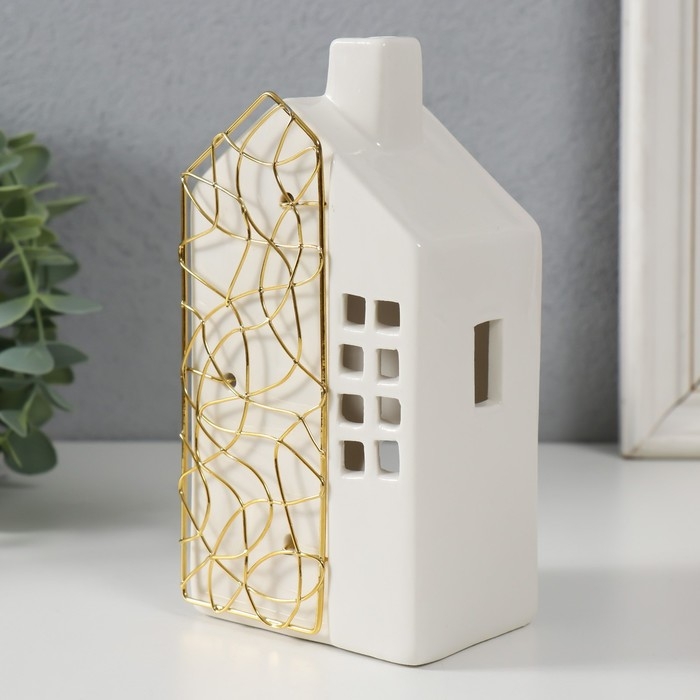 Подсвечник керамика, металл на 1 свечу "Дом" белый с золотом 9х6,3х16,7 см