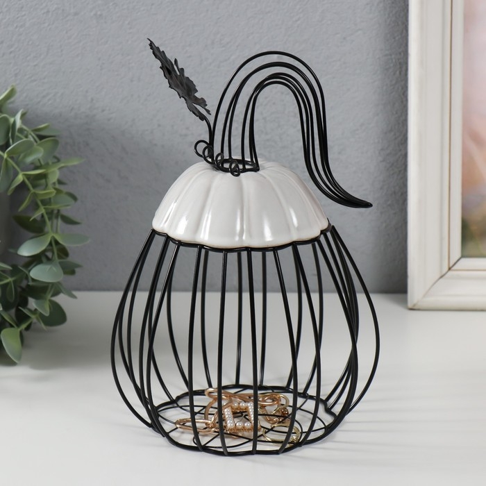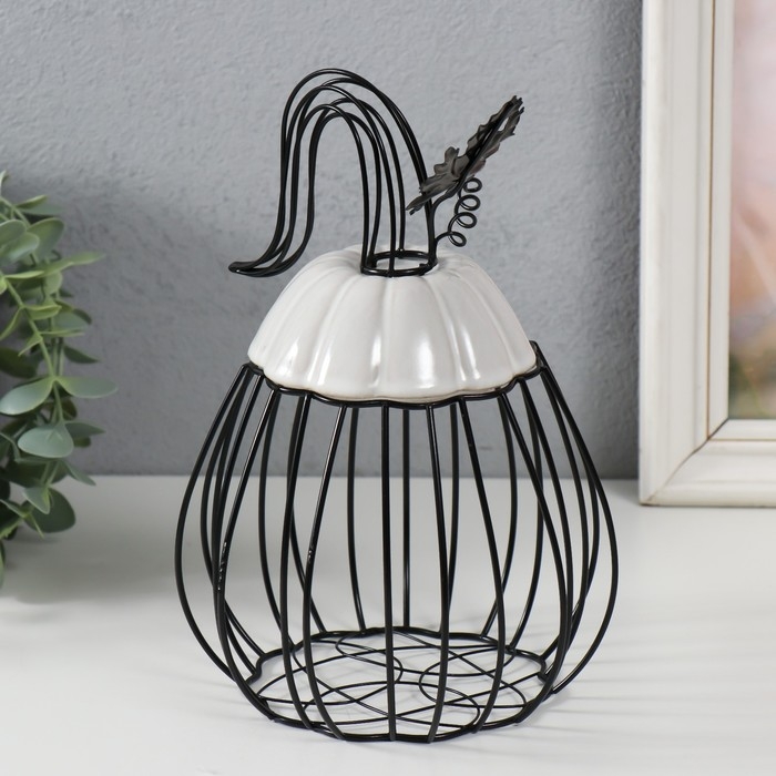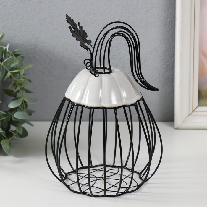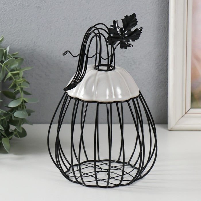 Сувенир вазон металл, керамика "Тыква с листочком" черная с белым 14,3х14,3х21 см