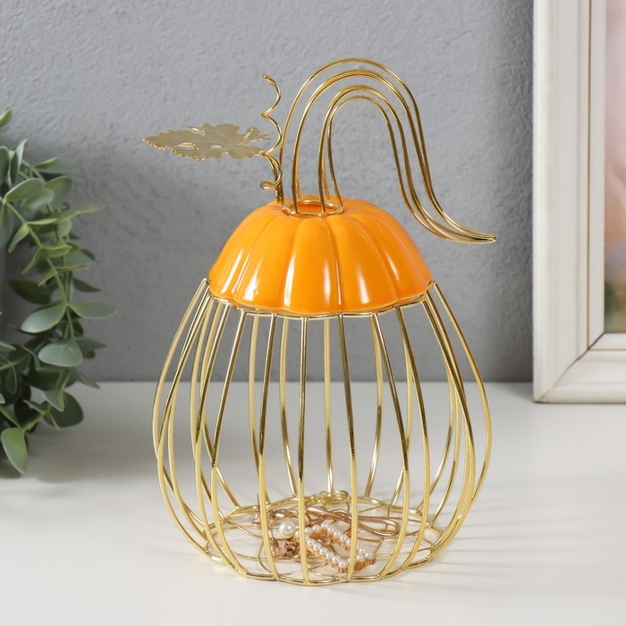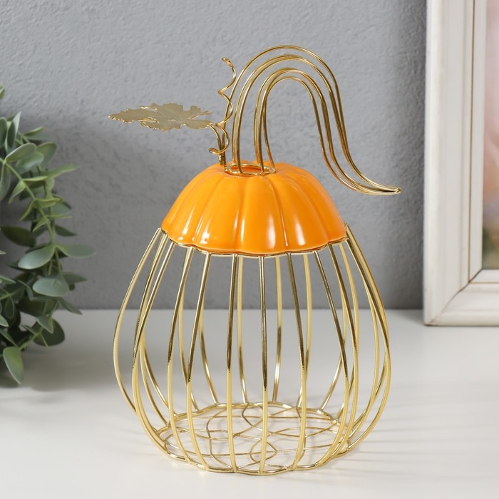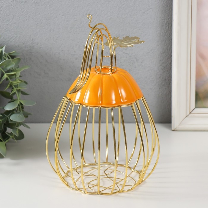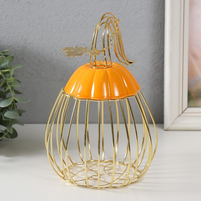 Сувенир вазон металл, керамика "Тыква с листочком" оранжевая с золотом 14,3х14,3х21 см
