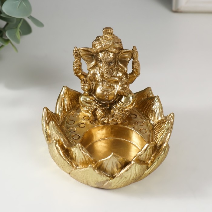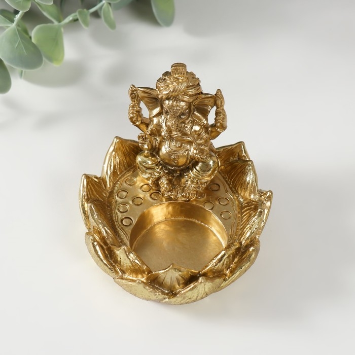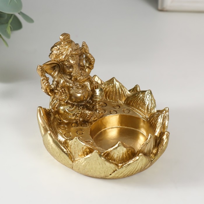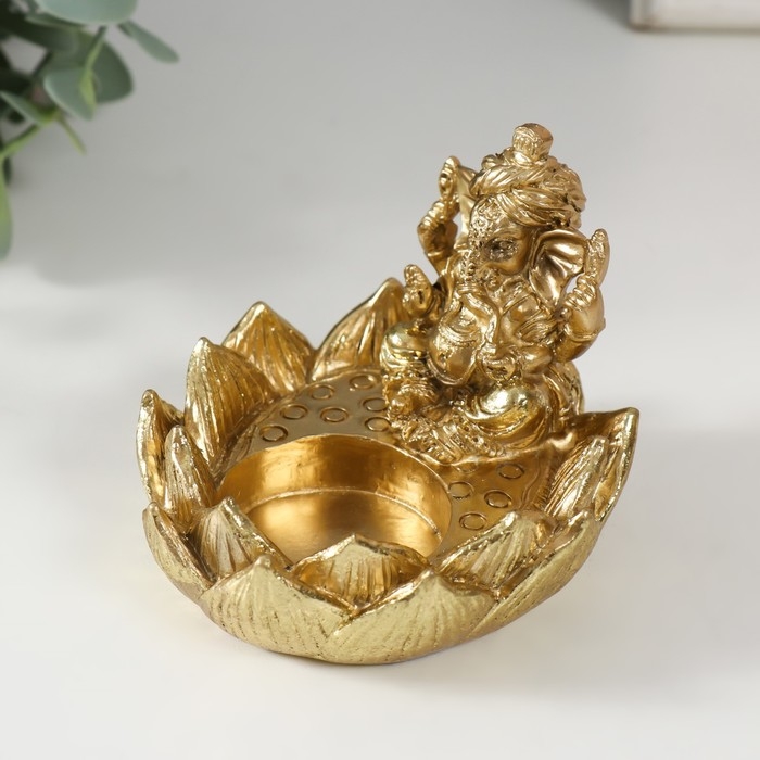 Подсвечник полистоун на 1 свечу "Ганеша в лотосе" золото 9х8,2х7 см